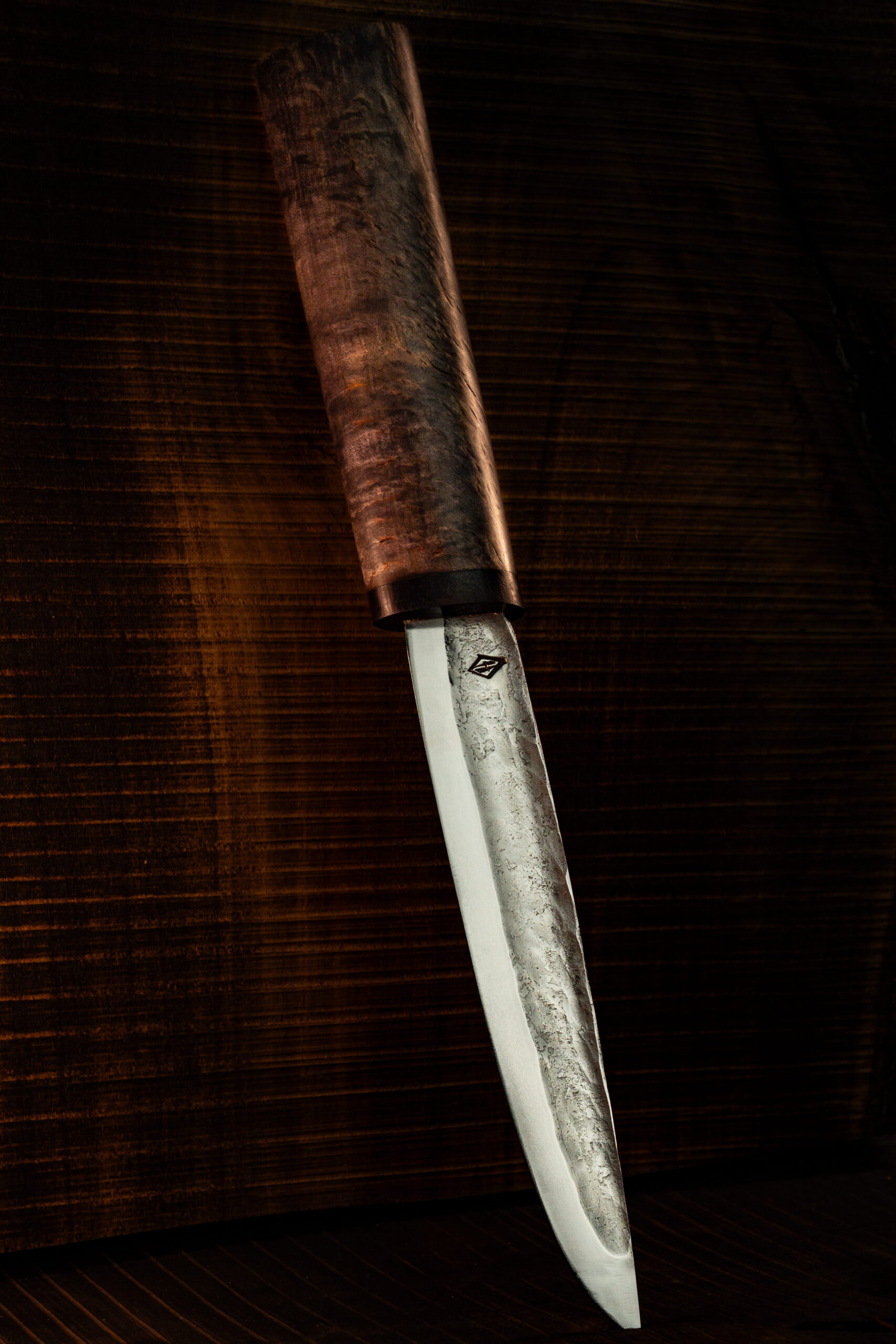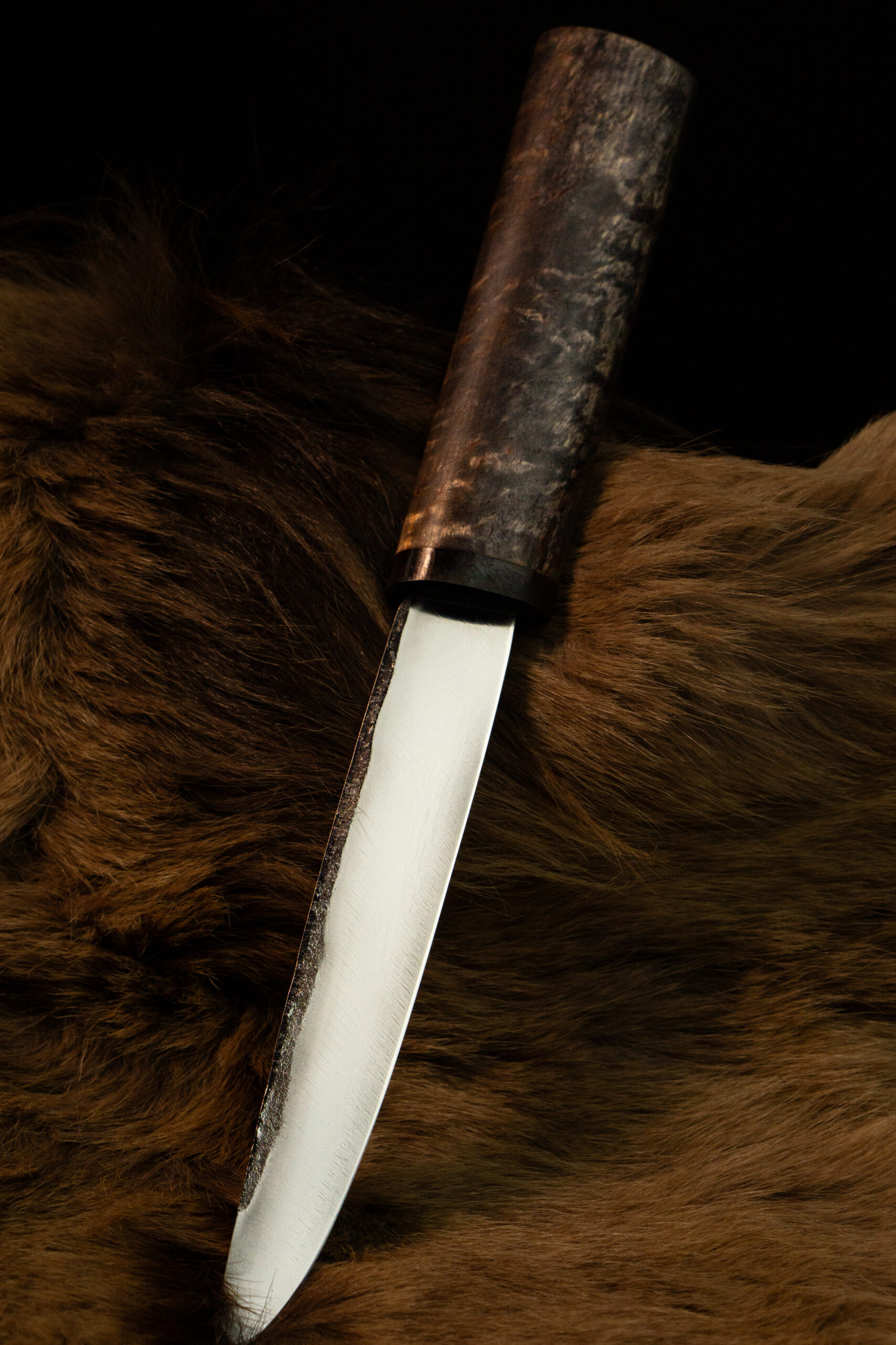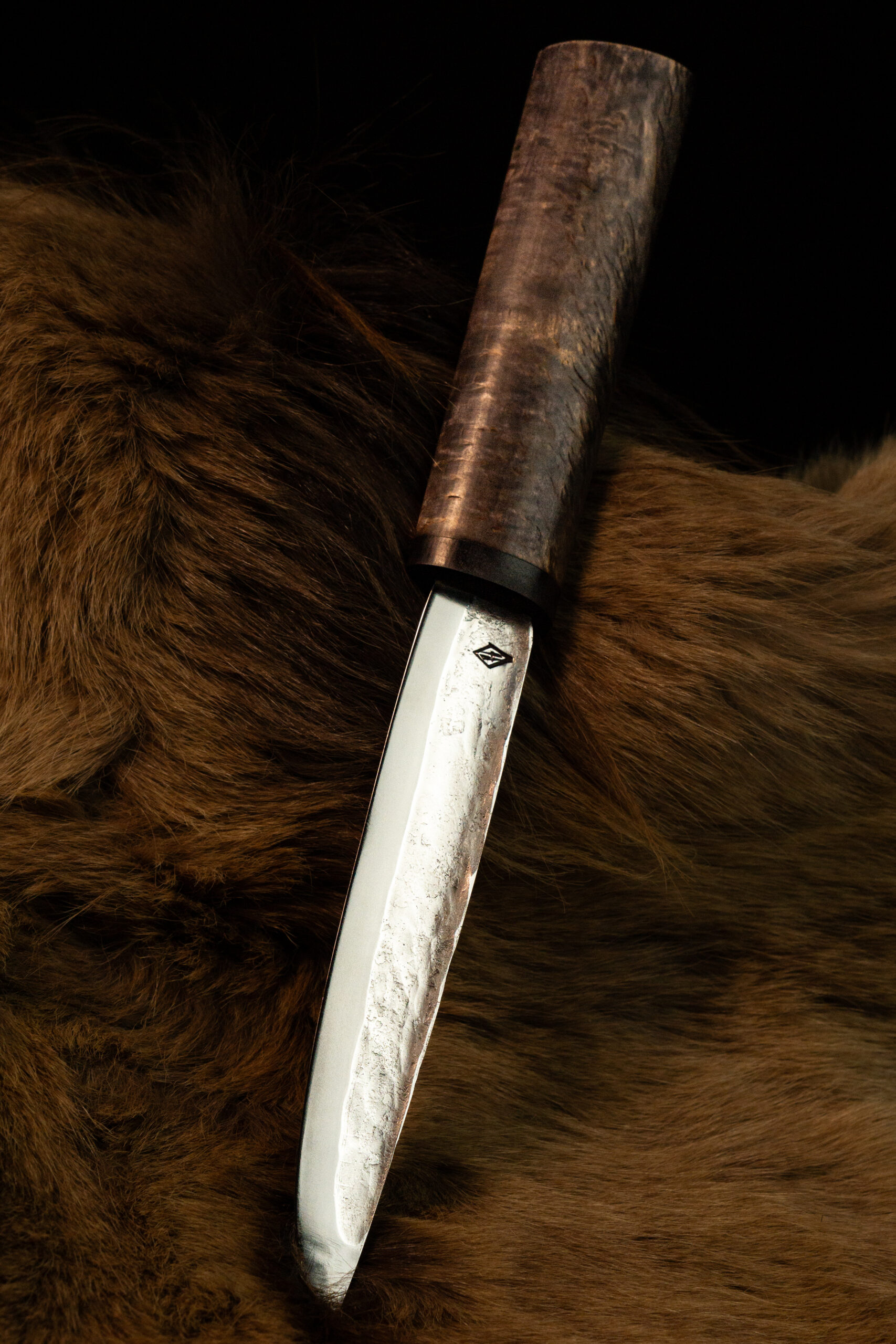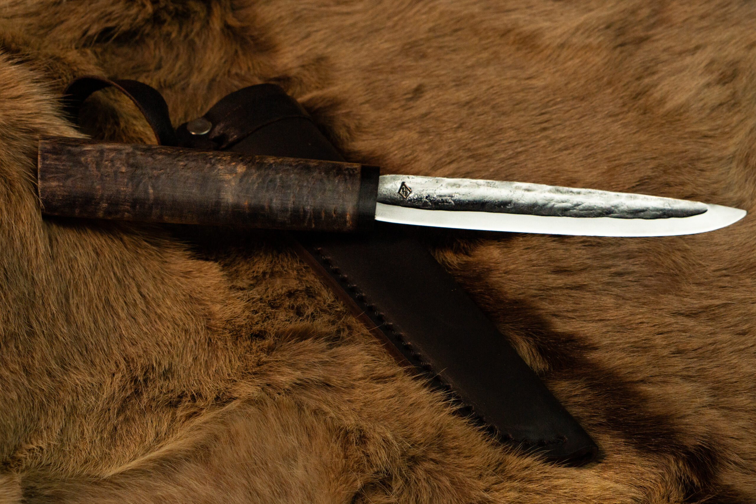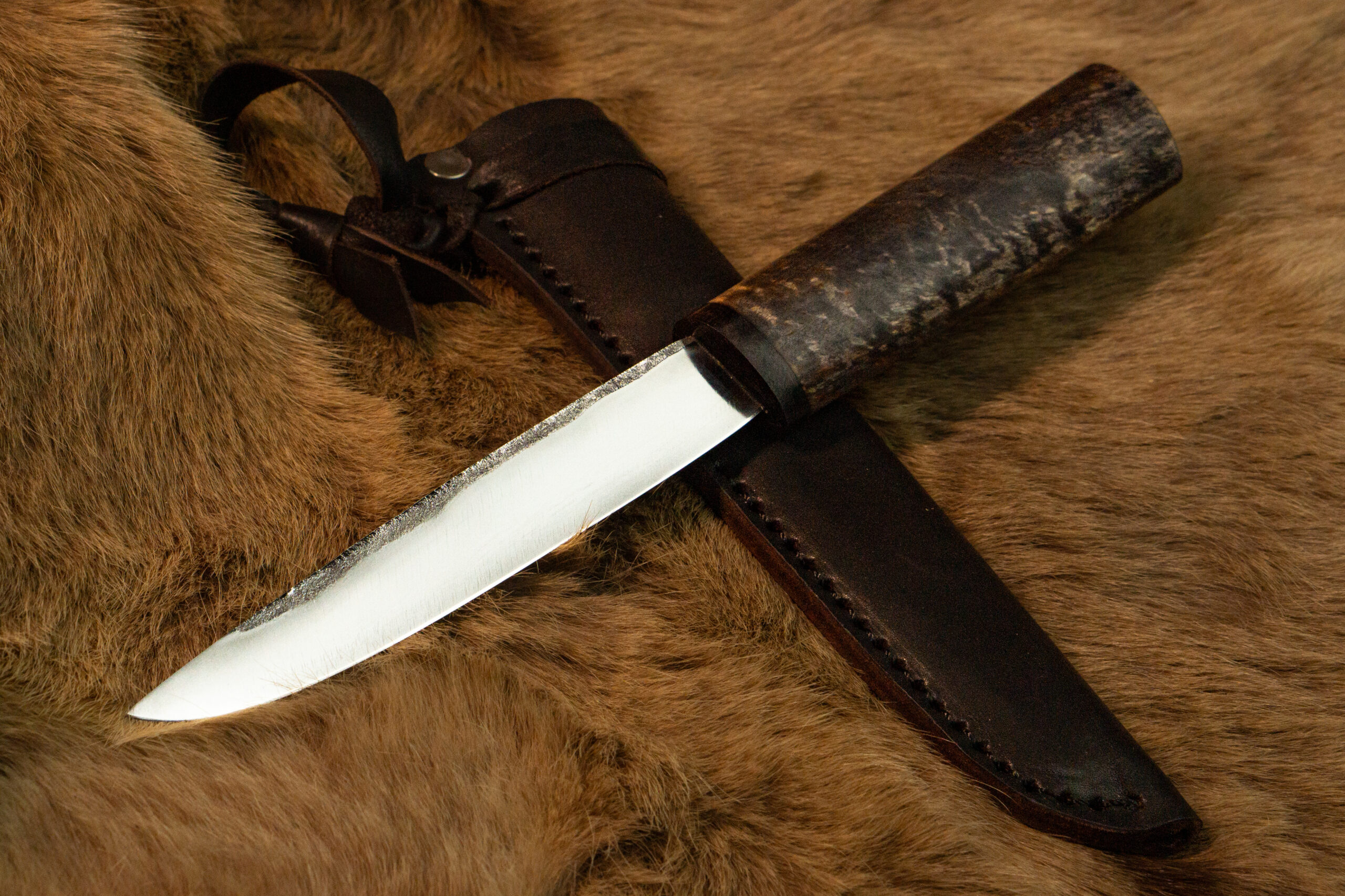 Клинок 130-140 мм с живой фактурой несёт отпечаток руки мастера, а тёплая рукоять из дерева хранит силу северной природы.