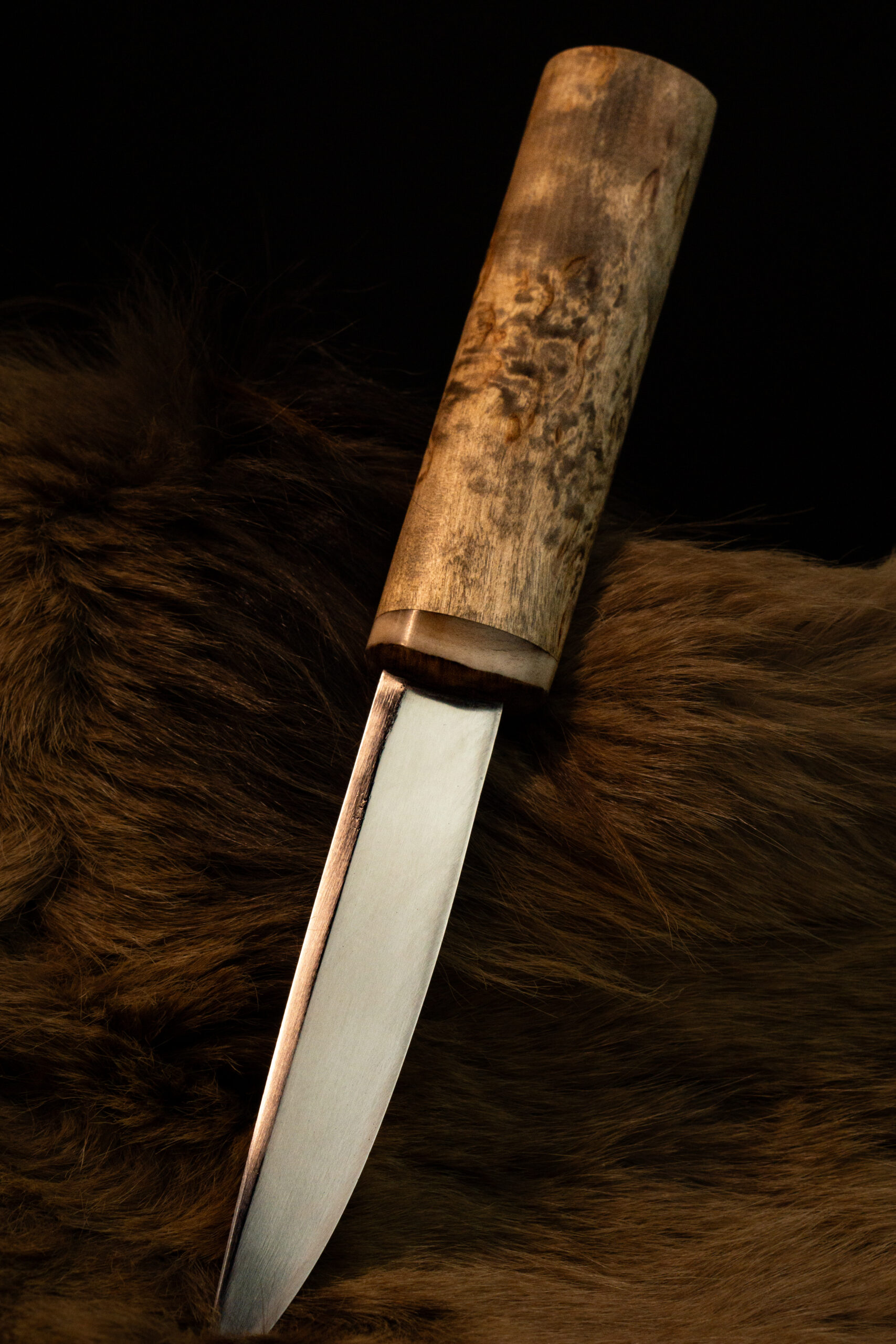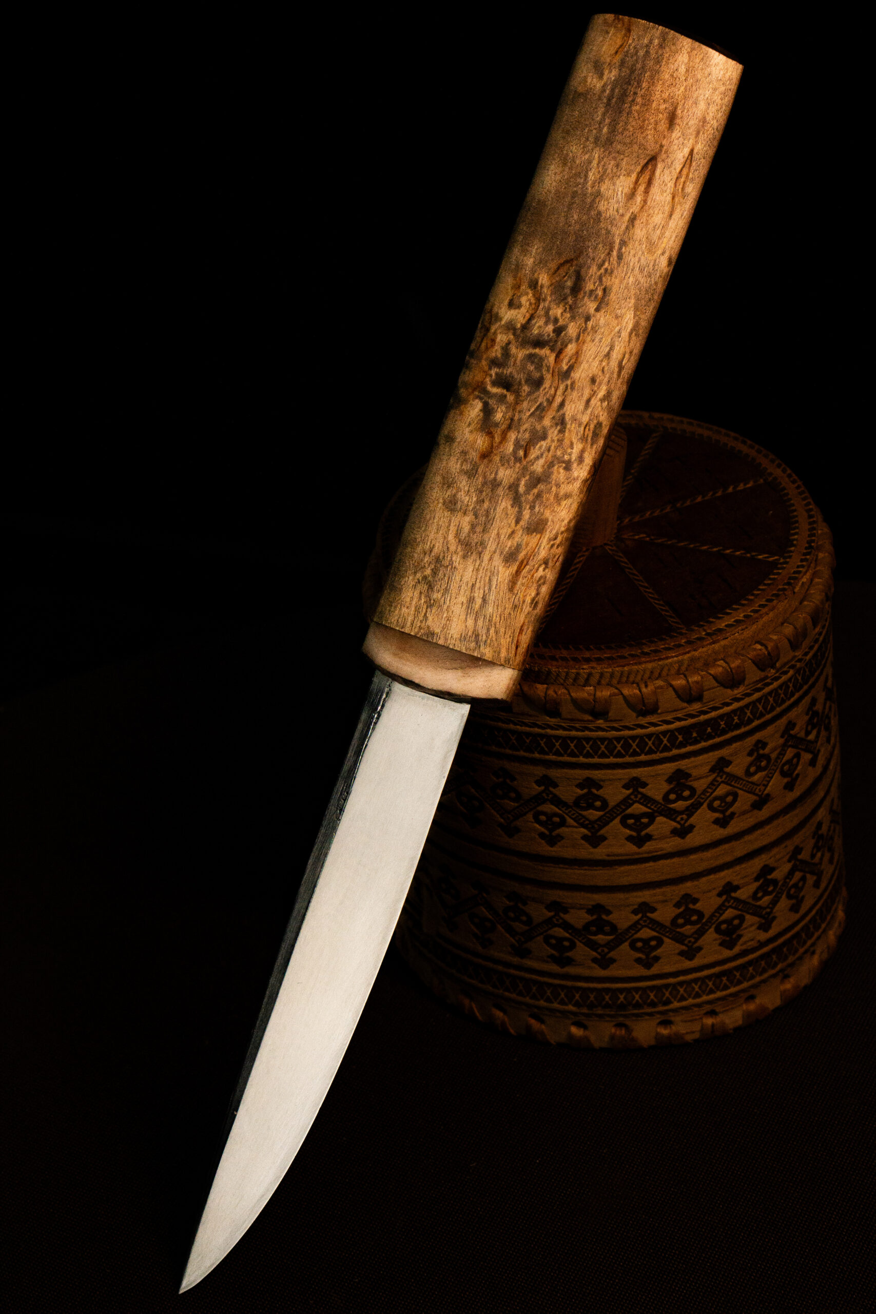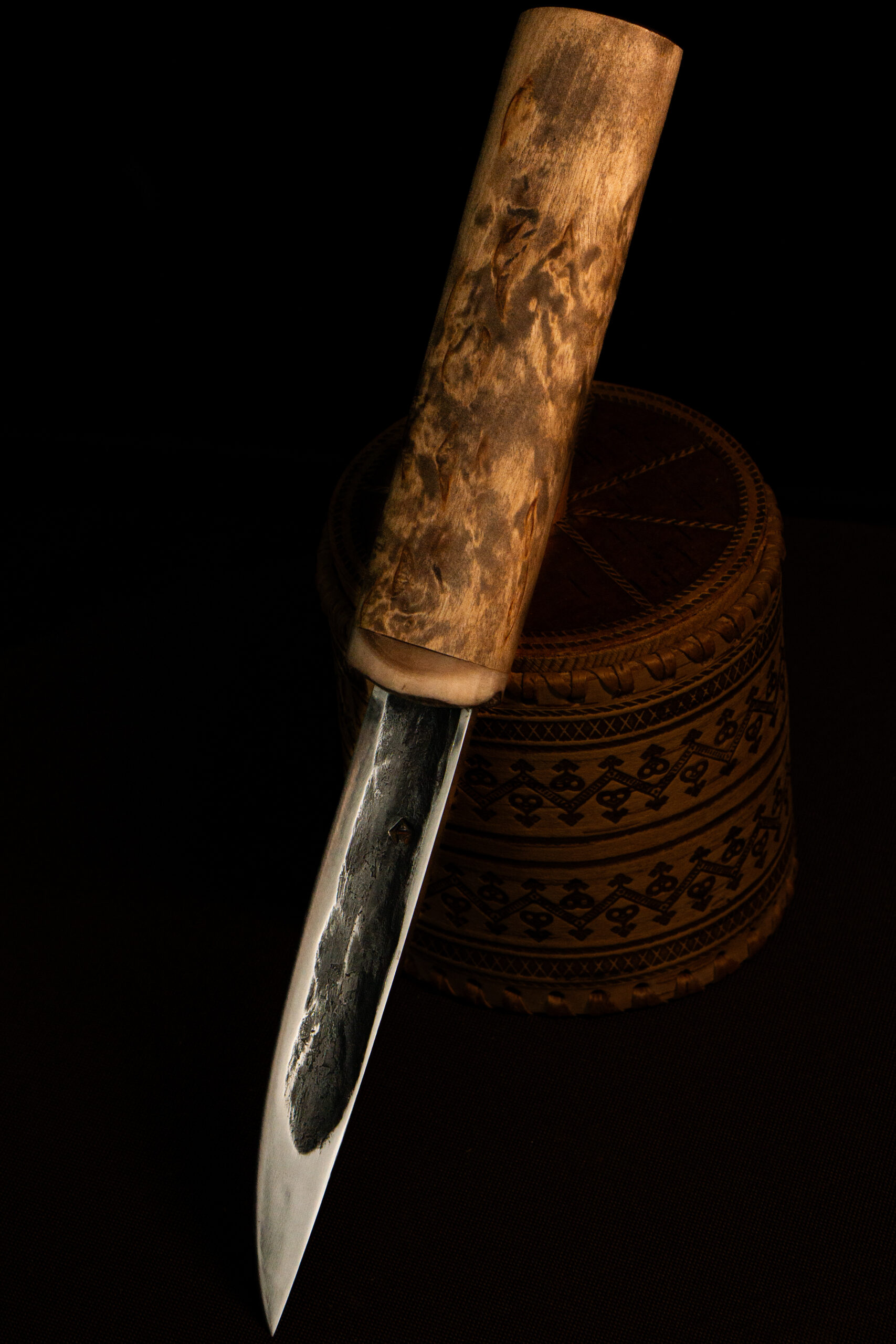Тайга — дом якутского народа, и нож всегда был первым инструментом, который берут с собой в лес. «Дух тайги» продолжает эту традицию. Клинок из стали Х12МФ с характерным долом легко справляется с зелёным деревом и мёрзлым мясом, а рукоять из карельской берёзы обеспечивает уверенный хват в долгие часы работы на стоянке. Больстер из рога горного барана придаёт ножу прочность и неповторимый облик.