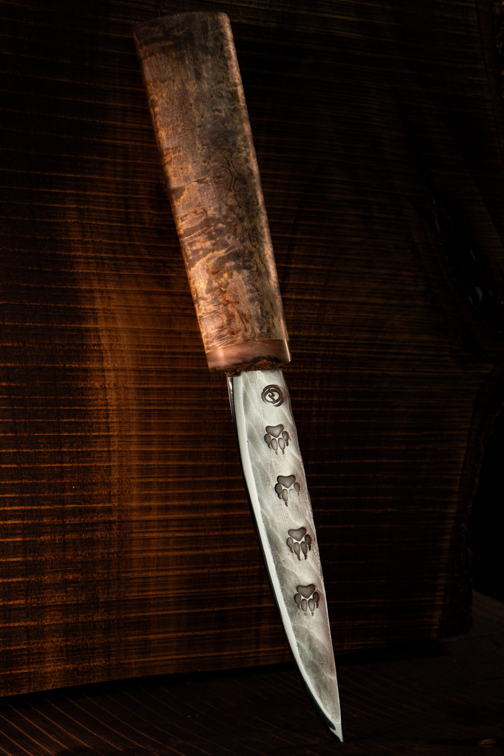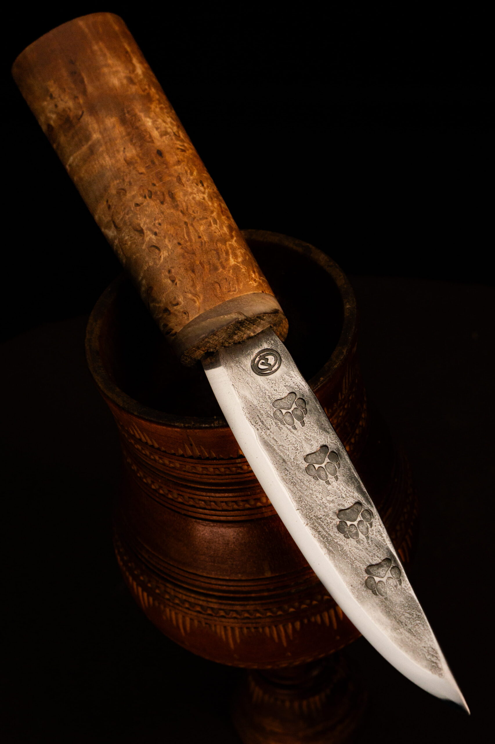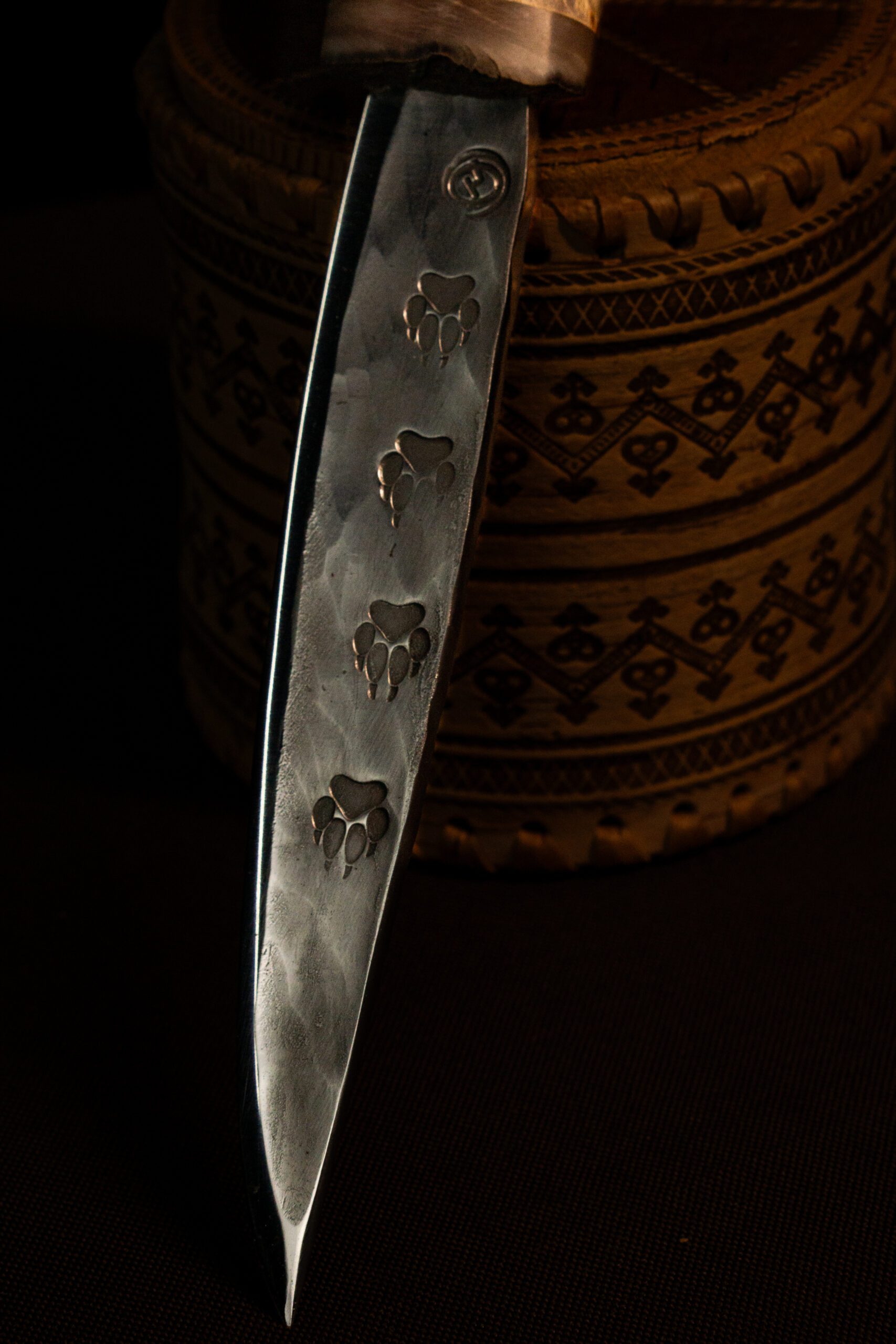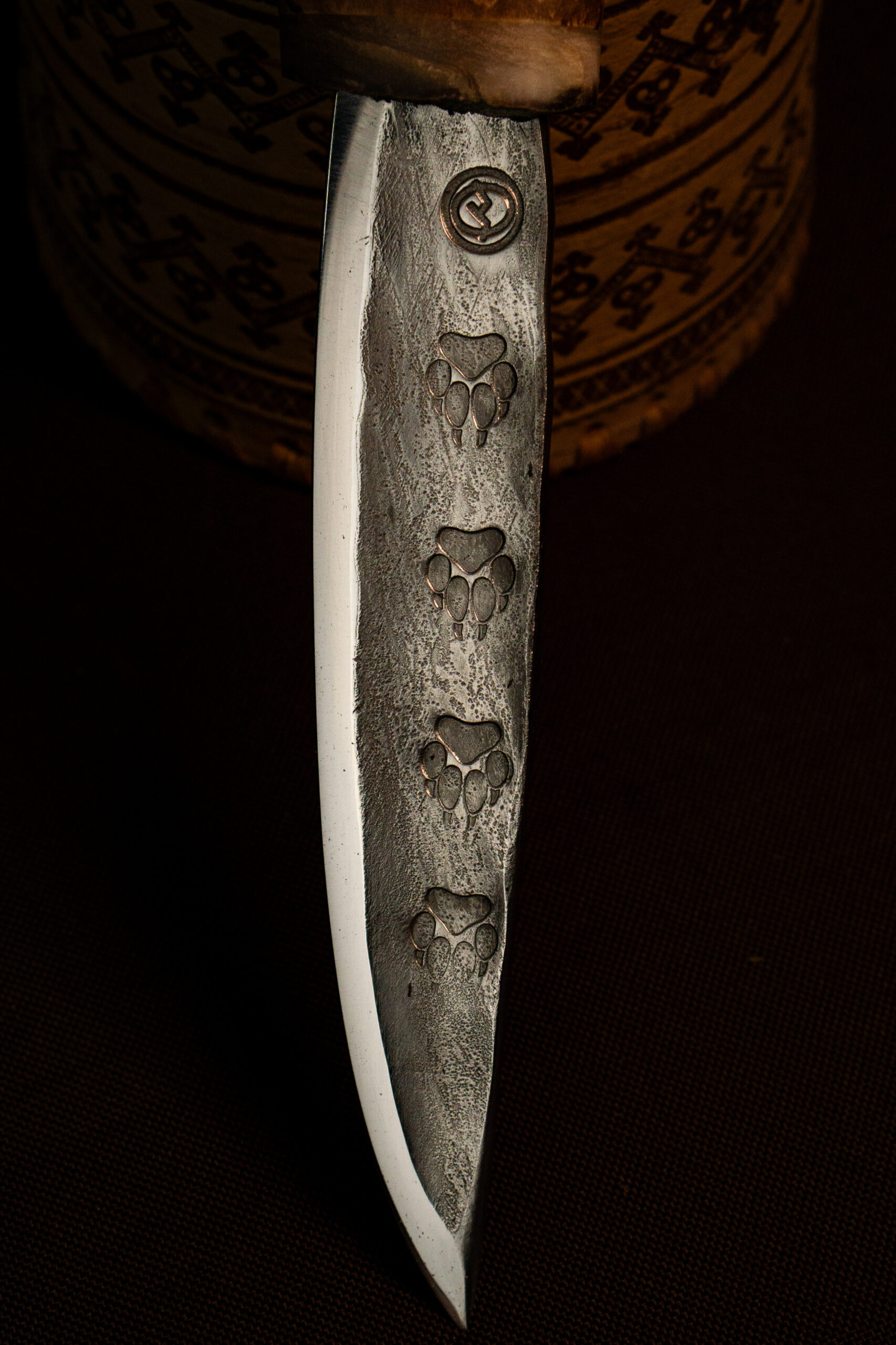 • Клинок — нержавеющая сталь 40Х13 с кованым узором следами волка