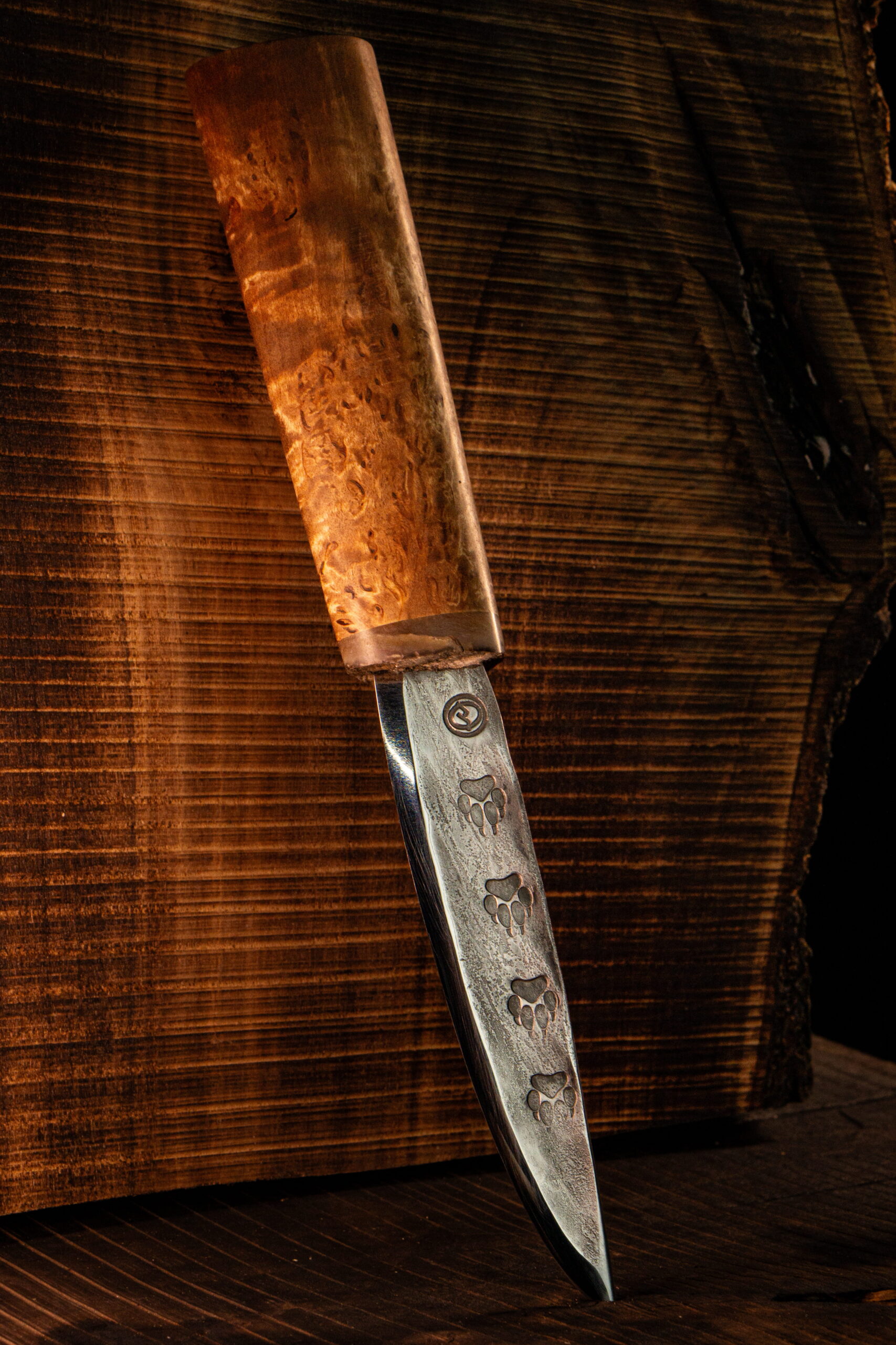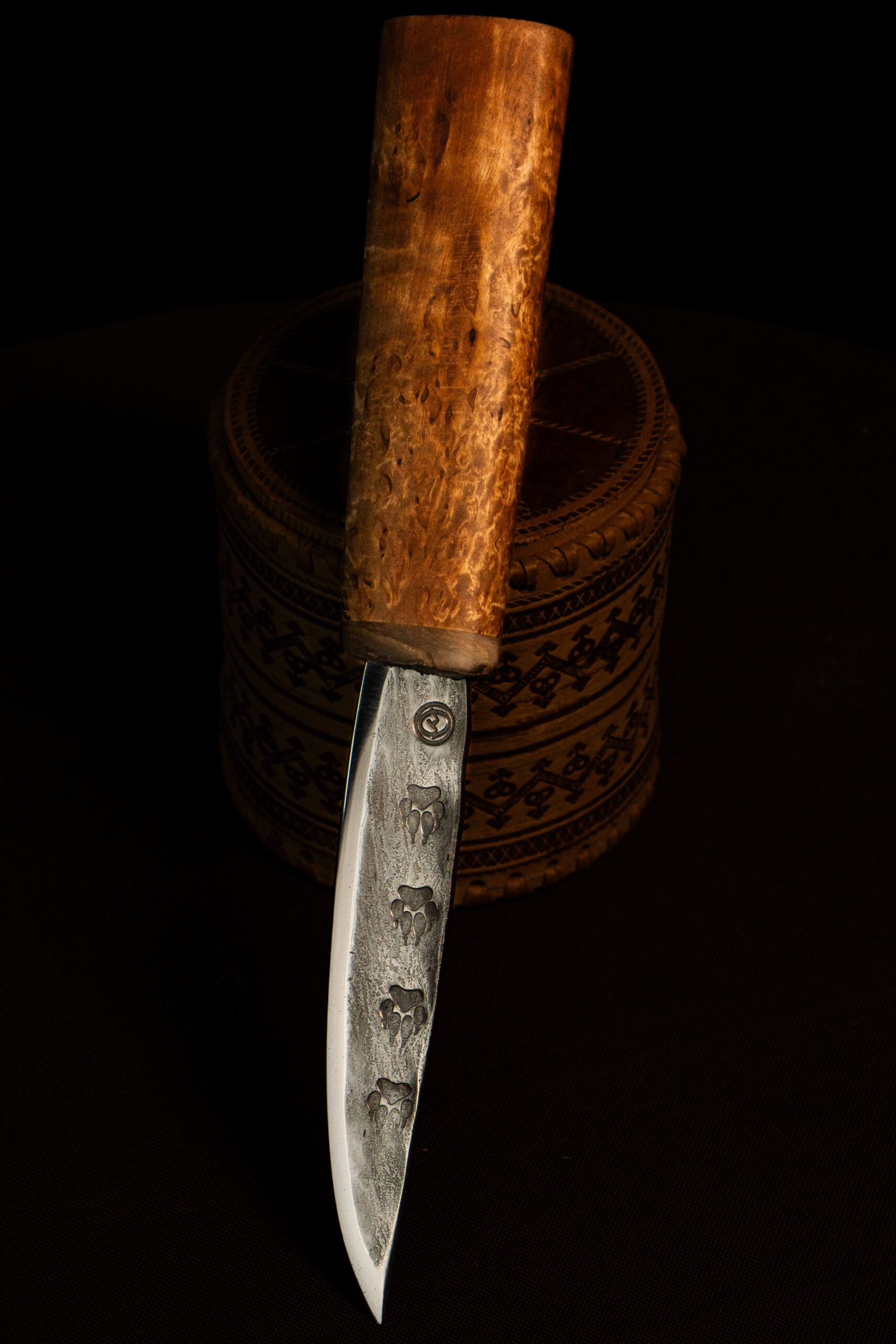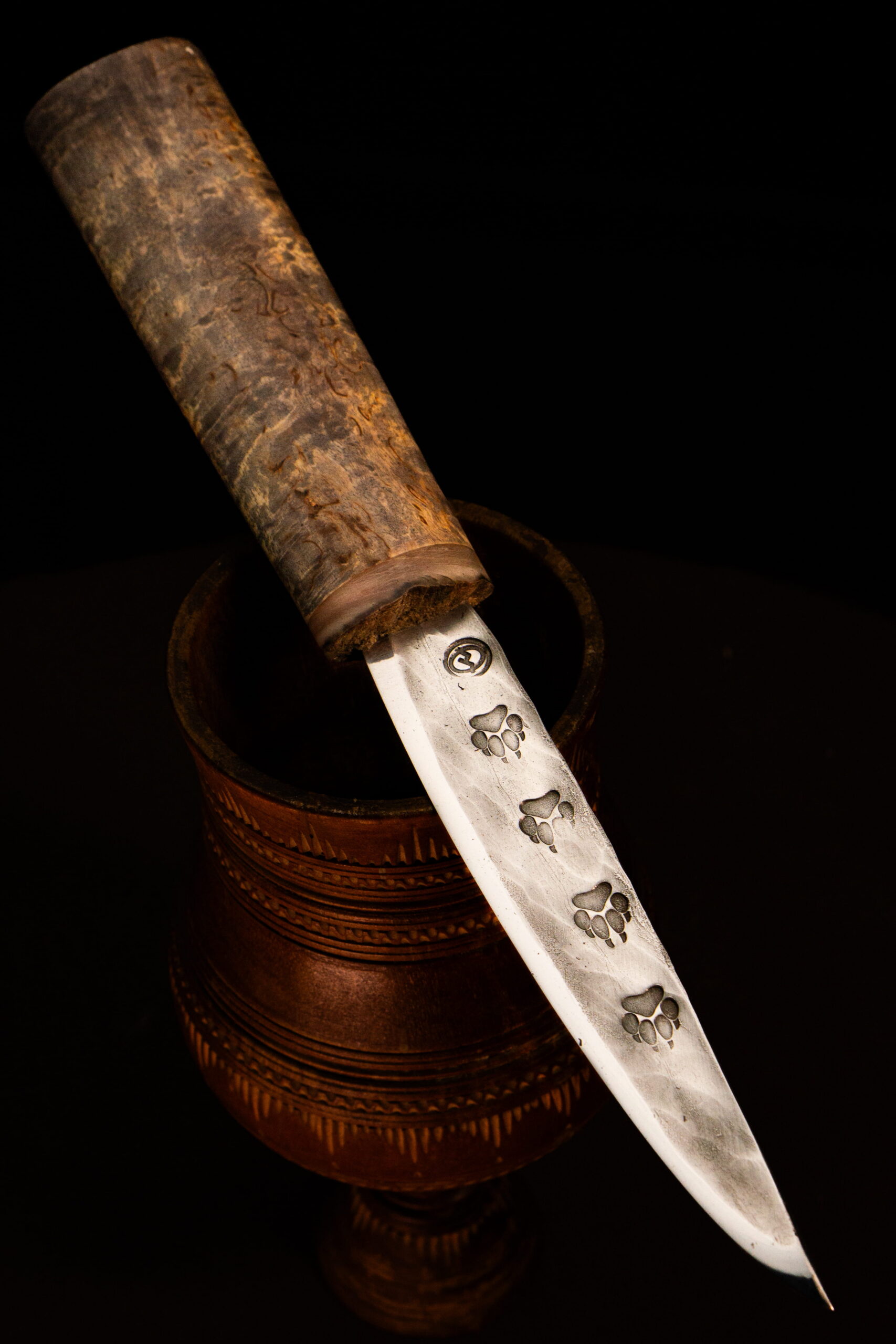• Клинок — нержавеющая сталь 40Х13 с кованым узором следами волка